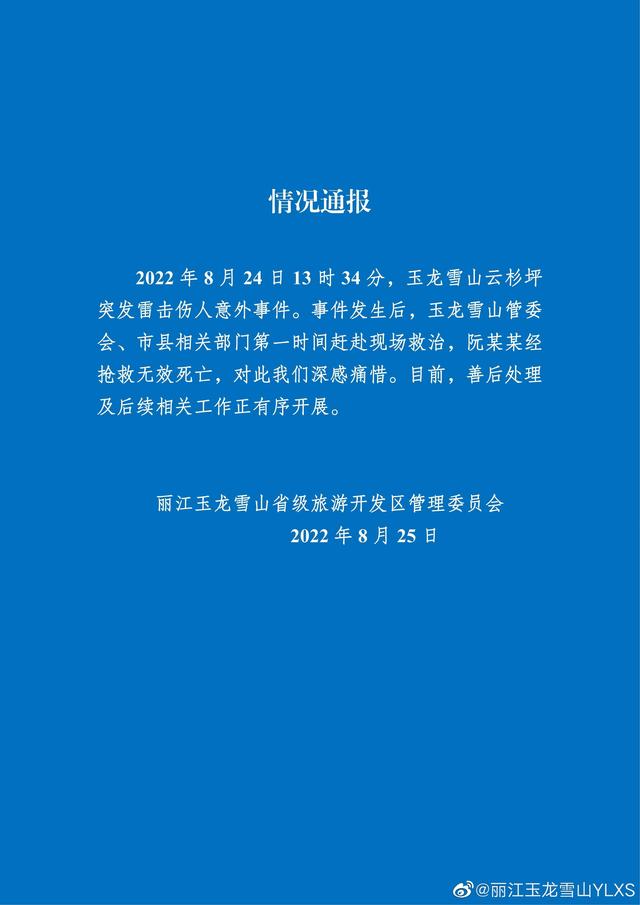 2022年8月24日13时34分,玉龙雪山云杉坪突发雷击伤人意外事件。事件发生后,玉龙雪山管委会、市县相关部门第一时间赶赴现场救治,阮某某经抢救无效死亡,对此我们深感痛惜。目前,善后处理及后续相关工作正有序开展。