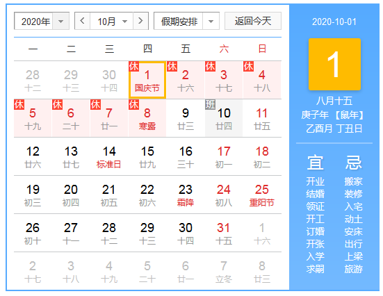 简述:2020年国庆节和中秋节是同一天。十一国庆放假共8天,从10月1日至10月8日放假调休,10月9日正式上班,其中在9月27日(星期日)、10月10日(星期六)都需上班。腾佑科技公司根据国务院办公厅