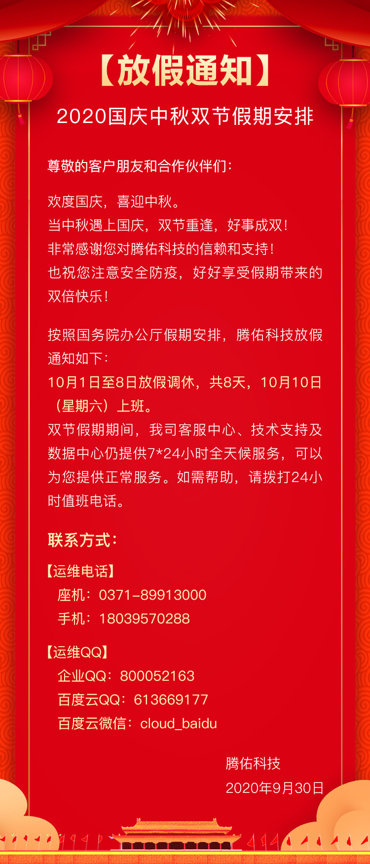 国庆假日期间如有业务到期,请您提前进行业务续费,避免因续费不及时给您带来不便。假期期间,我公司客服中心、技术支持及数据中心仍提供7*24小时全天候服务,可以正常为您提供维护、服务器操作、故障处理等服务!如您需要帮助,请拨打24小时值班电话。