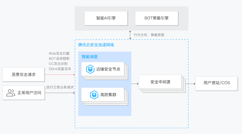 用户请求到达安全加速网络,节点识别并拦截各类攻击请求:分布式高防集群对 DDoS 攻击流量进行清洗,智能 AI 引擎、BOT 策略引擎对 Web、BOT、CC 类型攻击进行行为分析并更新拦截策略,阻断恶意请求到达客户源站,保障业务访问流畅稳定。