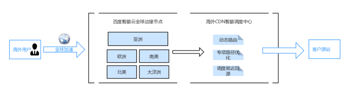 百度智能云海外CDN将客户的源站内容智能分发至遍布全球五大洲的优质加速节点,利用全球精准调度系统使用户端能够在就近节点超快速获取所需内容,极大地缩短用户端查看各类内容的延迟,提高用户端访问源站内容的响应速度,增强客户网站的可用性。解决了跨国跨网时,广泛存在的网络访问带宽小、用户访问量大、网点分布不均等问题。