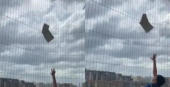 作业先是被吹到防盗网的高,一家人怎么够也够不到。就在想办法时,作业被风吹出了防盗网缝隙,瞬间消失不见。