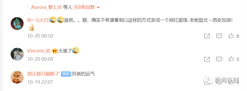 3月之内该店不得不两次停业,员工被隔离。接连“中招”,虽说是巧合,但不得不说这概率委实有点高。 消息一出,引发了众多网友同情,评论区里满满的是加油、鼓励、安慰的话语。 “最倒霉老板”倒真有可能由此收获巨大关注,在未来迎来一大拨“爱心消费”。不少西安本地的网友留言,“有机会一定去尝尝”。