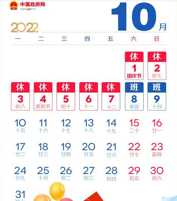 10月25日,国务院办公厅发布关于2022年部分节假日安排的通知。其中,春节:1月31日至2月6日放假调休,共7天。1月29日(星期六)、1月30日(星期日)上班。这意味着,春节放假前要连上7天班(从1月24日至1月30日)。国庆节:10月1日至7日放假调休,共7天。10月8日(星期六)、10月9日(星期日)上班。这意味着,国庆节后要连上7天班(从10月8日至10月14日)。